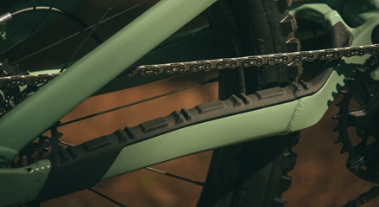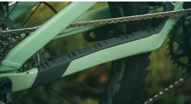 Protecciones integradas en la vaina (chainstay) y en la parte inferior del tubo diagonal, diseñadas para resguardar el cuadro frente a impactos, golpes de cadena y desgaste por uso intensivo.